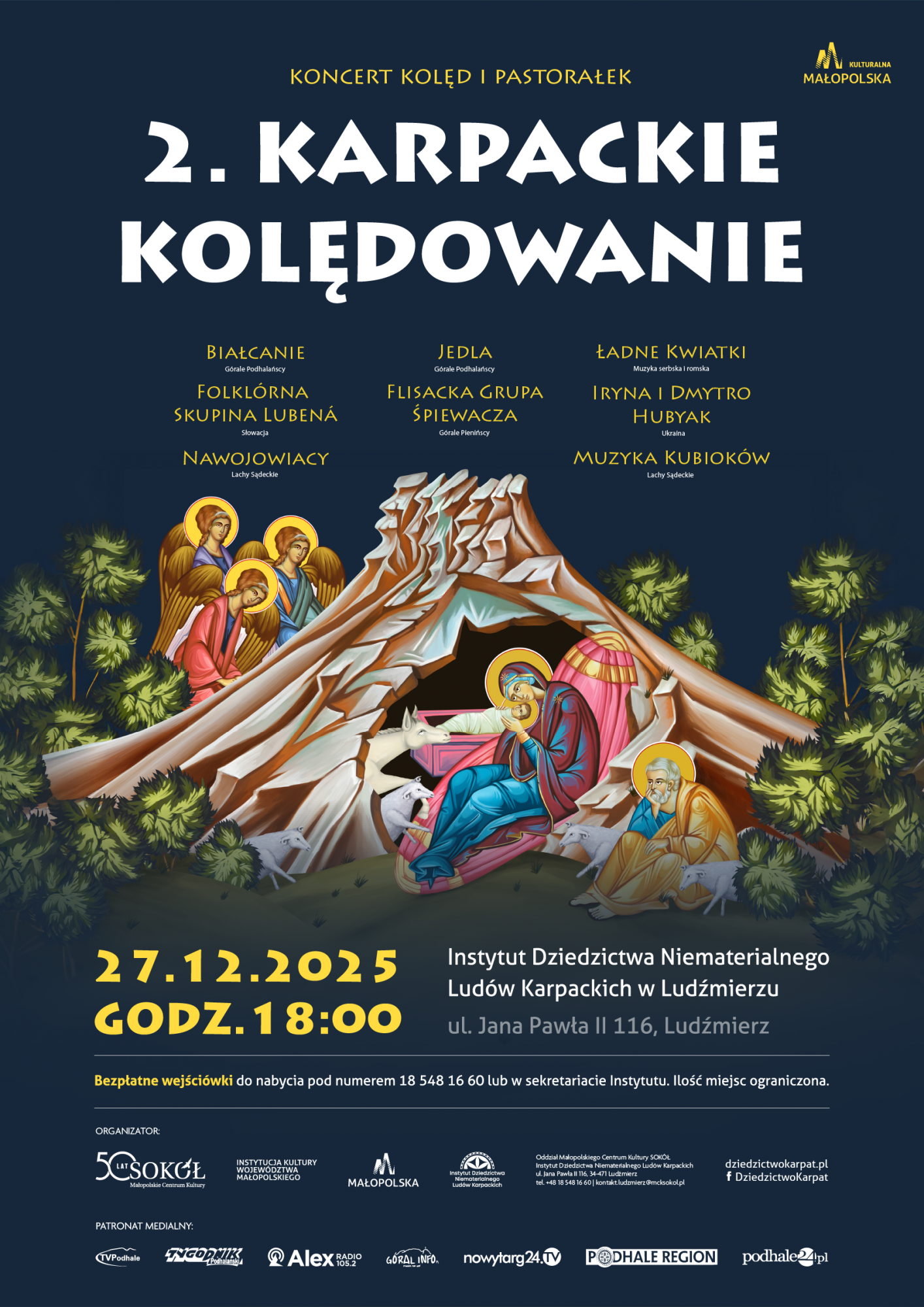 „Wśród nocnej ciszy głos się rozchodzi…” – zbliża się czas kolędowania, czas wspólnego śpiewu, który od wieków jednoczy ludzi w czasie Bożego Narodzenia. Małopolskie Centrum Kultury SOKÓŁ serdecznie zaprasza na 2. Karpackie Kolędowanie, które odbędzie się 27 grudnia 2025 roku o godz. 18:00 w Instytucie Dziedzictwa Niematerialnego Ludów Karpackich w Ludźmierzu.