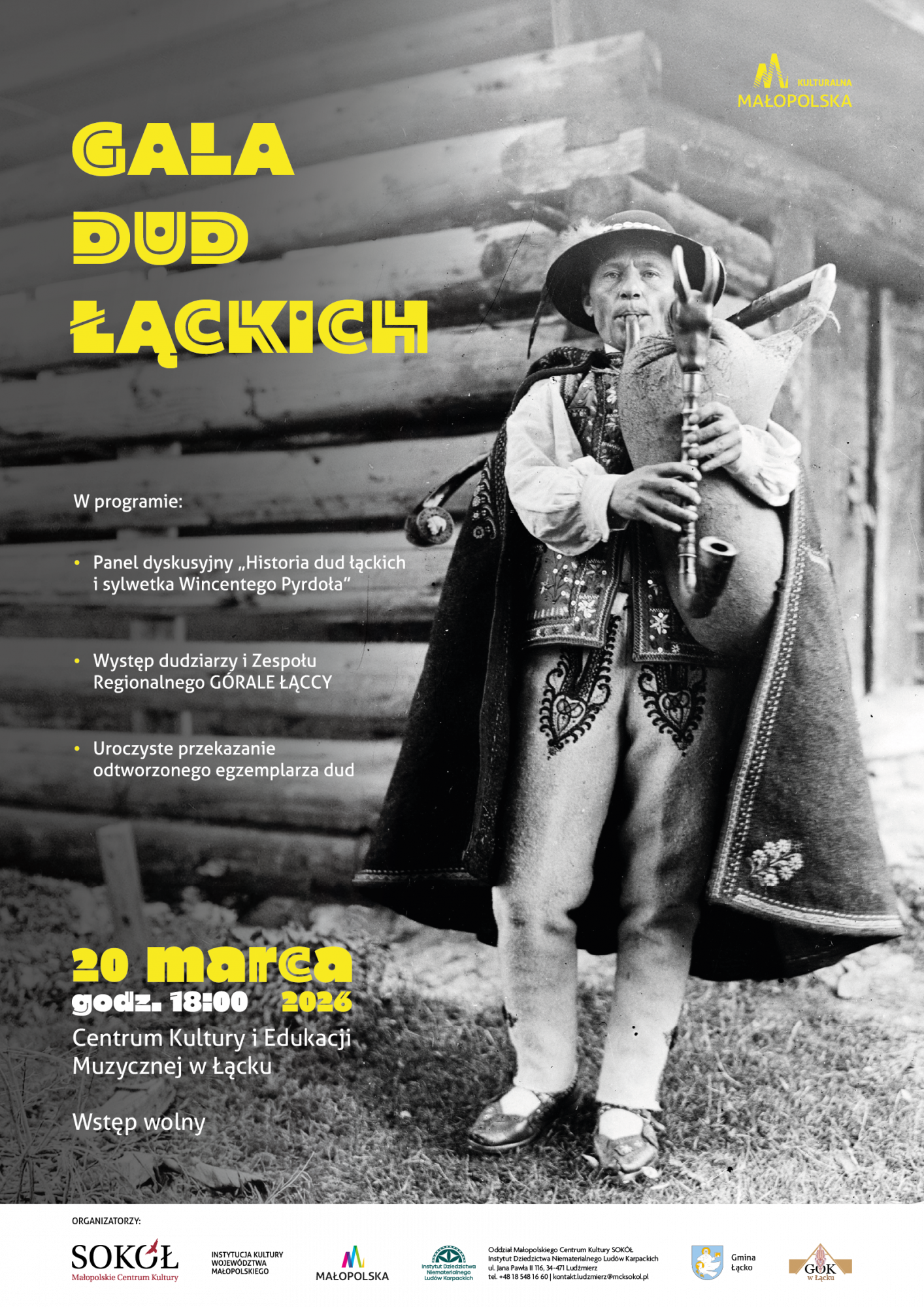 Małopolskie Centrum Kultury SOKOŁ, Gmina Łącko oraz Gminny Ośrodek Kultury w Łącku zapraszają serdecznie na wydarzenie pt. „Gala Dud Łąckich”, które odbędzie się 20 marca 2026 roku, o godz. 18:00 w Centrum Kultury i Edukacji Muzycznej w Łącku.