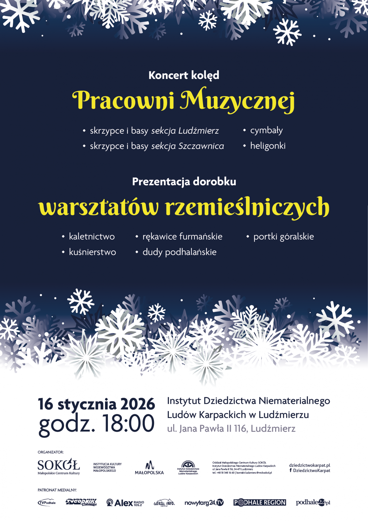 16 stycznia 2026 roku o godz. 18:00 w Ludźmierzu odbędzie się wydarzenie podsumowujące całoroczną działalność Pracowni Muzycznej oraz warsztatów rzemieślniczych Instytutu Dziedzictwa Niematerialnego Ludów Karpackich.