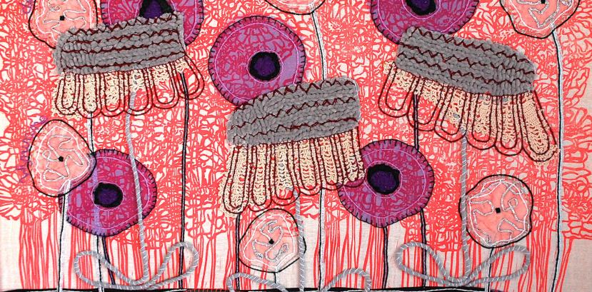Dojrzał we mnie pomysł na „to coś”, co dziergały jeszcze ręce mojej Mamy. Na pierwszy rzut oka to nie miało sensu, ale coś zaczęło „kiełkować” w mojej głowie, coś się rodziło… Stwierdziłam, że zrobimy coś RAZEM, zrobię nasze wspólne obrazy. Moje linoryty i „dzierganki” Mamy ubrane w kwiaty. Narodził się pomysł cyklu „Wyrwane demencji – mojej Mamie”.