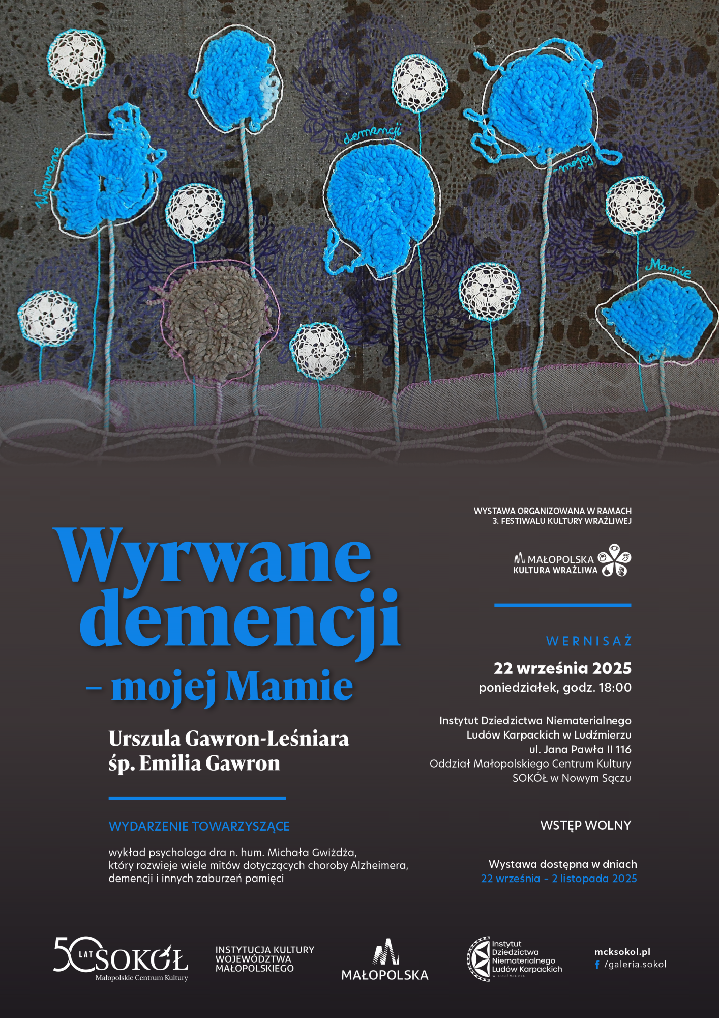 DEMENCJA – to okrutne słowo, które często w życiu wielu osób zmienia wszystko. Ostatnie cztery lata życia mojej Mamy były niestety naznaczone tą chorobą. To był wyścig z czasem i próba ratowania resztek pamięci i Jej człowieczeństwa, godności… W ramach terapii zajęciowej kupowałam jej włóczki, żeby miała zajęcie, które da jej radość, przyniesie odrobinę relaksu, usprawni manualnie. Jednak choroba była nieubłagana i powoli zabierała Jej także tę umiejętność. Mimo to zbierałam wszystkie „wytwory”, które Mamie udało się jeszcze zrobić, bo ich wartość sentymentalna, osobista była dla mnie ogromna, chociaż wtedy nie wiedziałam jeszcze po co to robię. Nie mogłam na początku uwierzyć, że z tego wszystkiego co Jej mózg potrafił, na końcu zostały tylko ściegi podstawowe i to jeszcze z pomyłkami… Nie wiedziałam co z tym zrobię, ale wiedziałam, że na pewno coś z tego powstanie. Chciałam jeszcze tymi ręcznymi robótkami wyrwać tej chorobie moją Mamę, jakoś ją ocalić, ocalić w niej to co było NIĄ.